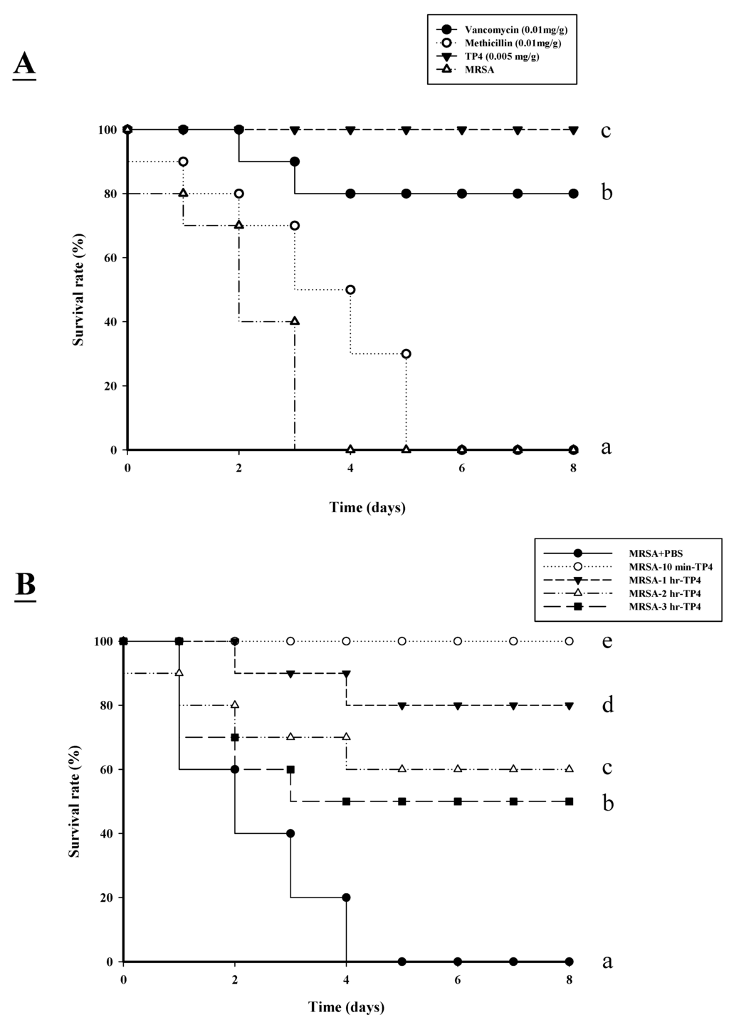 Female Balb/c mice (6–8 weeks old) were injected intraperitoneally with 106 CFU MRSA per mouse. Ten minutes after MRSA injection, mice were injected intraperitoneally with vancomycin (0.01 mg/g mouse body weight), methicillin (0.01 mg/g mouse body weight), or TP4 (0.005 mg/g mouse body weight). In a second set of experiments, mice were given intraperitoneal injections of TP4 (0.005 mg/g mouse body weight) at 10, 60, 120, or 180 min after MRSA injection. Survival rate and status were recorded every 24 h for up to 192 h. To examine bacterial dissemination, mice were sacrificed at 48 h after injection with antibiotics or TP4, and the bacterial numbers in blood, peritoneum, spleen, liver, and mesenteric lymph nodes were recorded. Colony counts from the diluted bacterial solutions were expressed relative to those at the start of treatment. These experiments consisted of four groups, and each group contained 10 mice.