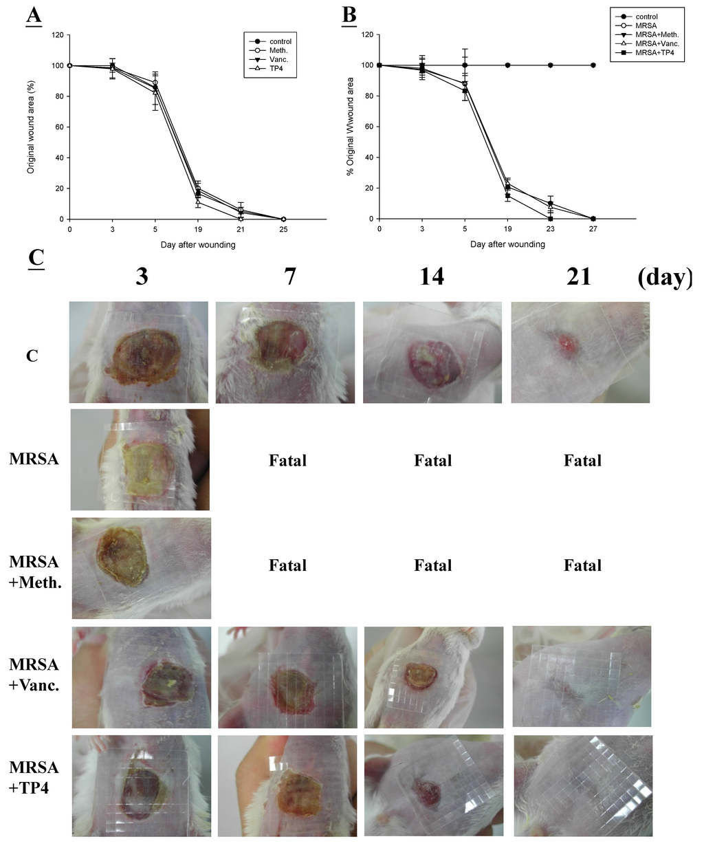 Closure of clean and contaminated wounds. The areas of full-thickness wounds (initially 1 cm in diameter) were measured from the time of wounding until closure. (A) All full-thickness aseptic wounds closed by day 25. Meth., methicillin; Vanc., vancomycin; (B) Full-thickness wounds contaminated with microorganisms increased in size initially, while TP4-treated wounds did not exhibit the initial expansion and closed somewhat faster (day 21) than vancomycin-treated wounds; (C) Photographs of representative wounds. “Fatal” indicates that no mice survived.