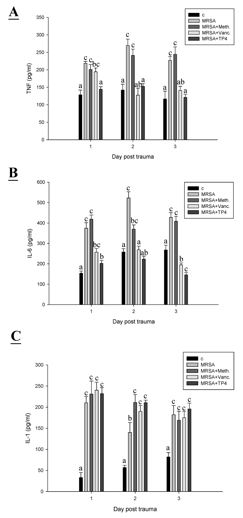 TP4 modulates MRSA mediated-induction of TNF, IL-6, and IL-1. A skin region of about 1 square centimeter was removed from the abdomen of non-anaesthetized mice, and the wound was infected with 50 µL of broth mix containing 106 CFU of MRSA alone, or together with methicillin, vancomycin, or TP4. At different days post-infection, (A) TNF; (B) IL-6; and (C) IL-1 were detected in serum by ELISA. Values with different letters show significant differences (P < 0.05) between time points, as determined by ANOVA.