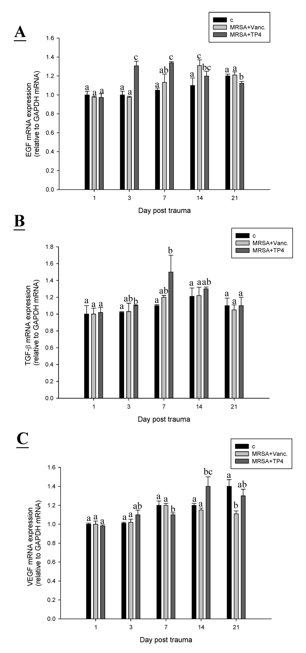 TP4 affects expression profiles of cell proliferation genes in infected wounds of mice. Adult mice were infected with MRSA, and treated with TP4 or antibiotics, while controls were infected but untreated. On the indicated days, total RNA was isolated from the wound and reverse transcribed for use in real-time qPCR analysis of EGF (A); TGF-β (B); and VEGF (C) gene expression. Values with different letters show significant differences (P < 0.05) between time points, as determined by ANOVA.