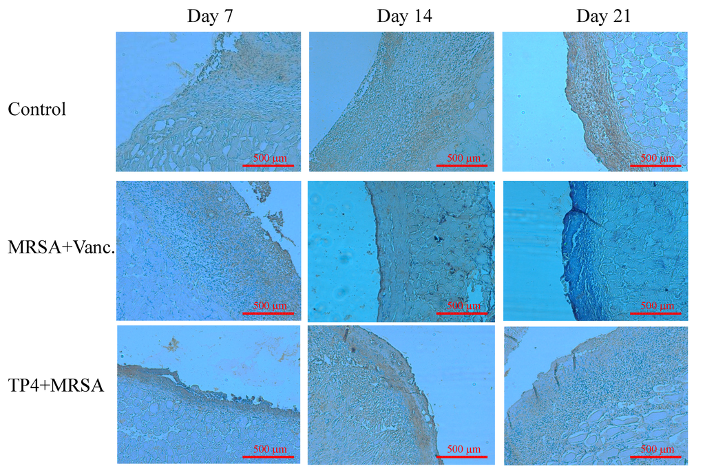 The goal of the current study was to examine the antimicrobial, anti-inflammatory, and wound healing properties of TP4 treatment in MRSA-infected mice. We investigated whether treatment of a mouse model with peptide (AMPs) can (i) enable the identification of novel candidates for antibacterial therapeutic drugs; (ii) inhibit bacterial growth; and (iii) accelerate wound closure.