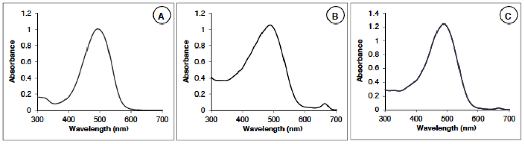 Spectrophotometric measurements were made on a Perkin Elmer Lambda 12 Spectrophotometer in the UV-visible domain (200–800 nm), using a scan speed of 50 nm/min. The AstaS spectra show a maximum absorption at 490 nm. A calibration curve was obtained from AstaS.