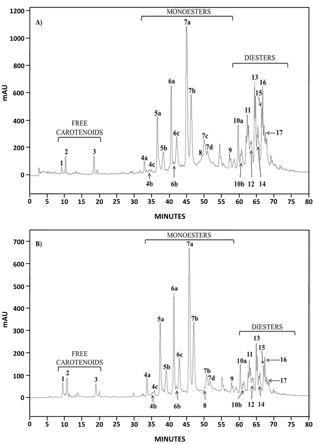 HPLC chromatograms (DAD, 482 nm) of AstaP (A) and AstaCO2 (B).