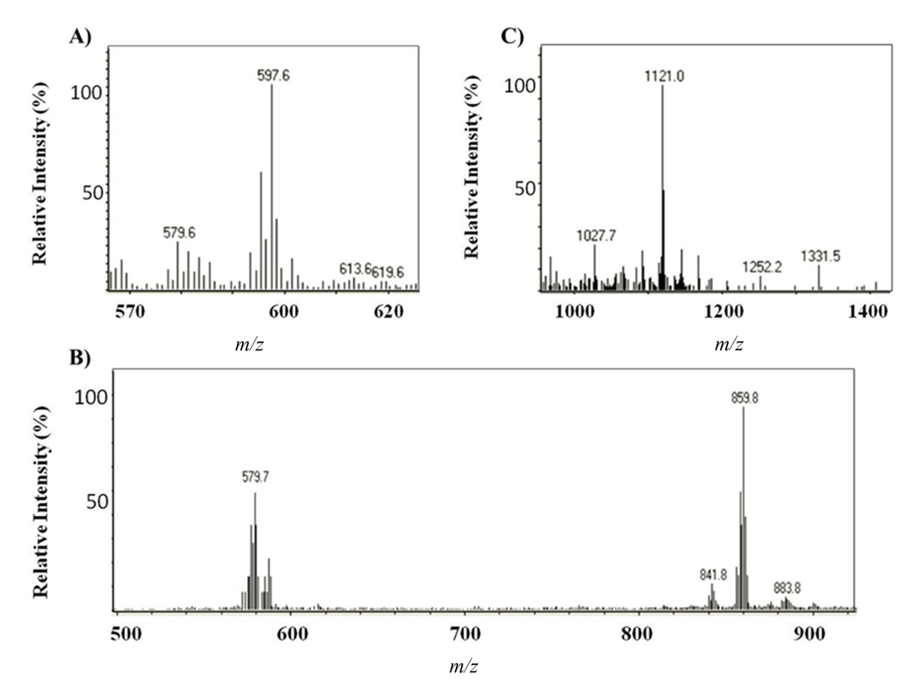 Mass spectra obtained by HPLC-APCI+ for (A) astaxanthin, (B) the astaxanthin monoester (ME) C18:2 and (C) the astaxanthin diester (DE) C18:3/C18:2 The assignment of respective ions is as follows: (A) m/z 597.6 ([M + H]+), m/z 579.6 ([MH − H2O]+); (B) m/z 859.8 ([M + H]+), m/z 579.7 ([MH − C18:2(280.1)]+; (C) m/z 1121.0 ([M + H]+).