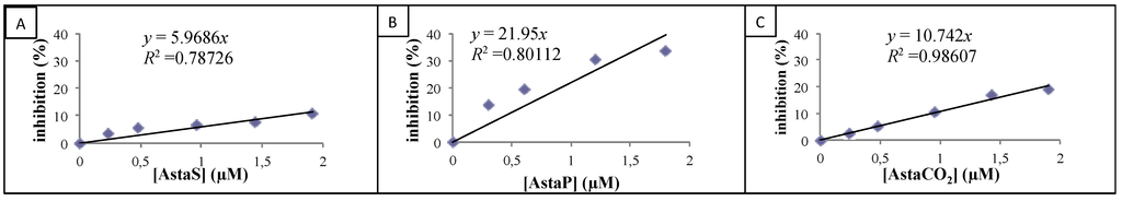 The antioxidant activity of astaxanthin samples against 2,2′-azobis(2-amidino-propane (AAPH) peroxyl radicals was chemically analyzed using the ORAC method. The ORAC test is a standard test based on the kinetic evaluation of hydrogen atom transfer-type reaction []. The decrease of the fluorescence intensity of fluorescein due to the action of AAPH was monitored during 1 h. The scavenging effect of samples was studied, and the antioxidant activity of AstaP, AstaS and AstaCO2 was evaluated as the capacity to retain the fluorescence of fluorescein in the presence of AAPH. A calibration curve of Trolox (reference antioxidant molecule) was drawn by plotting the area under the curve (AUC) vs. Trolox concentration (1–100 µM). The antioxidant activity of the samples was calculated relative to the Trolox activity, and the results are presented in Table 2, expressed as Trolox equivalent µM. The results showed that the antioxidant activity of synthetic astaxanthin is 1.6 µM TE. This value is in agreement with those published by Naguib [] for commercial astaxanthin in concentrations of the same order of magnitude as those that we used. The antioxidant activity obtained by the ORAC test shows a different absolute value than that obtained by the ABTS test; however, we observe the same tendency of the results, namely AstaP > AstaCO2 > AstaS.