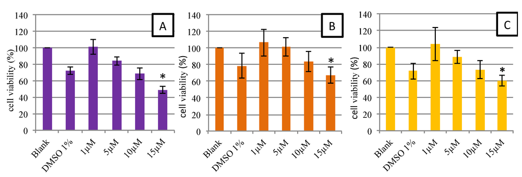 HUVEC cells were seeded in uncoated 24-well cell-culture plates (6 × 104 cells/well) with medium for 48 h. The cells were then treated with various concentrations of astaxanthin (1–15 µM). The final DMSO concentration in the assay in astaxanthin samples never exceeded 1% and had no influence on cell growth. Samples were added at the time of seeding in order to obtain concentrations of 0, 1, 5, 10 and 15 µM. In addition to the control group, we also cultured cells in a medium without sample, but containing 1% DMSO. After 48 h, a total of 1 mL of MTT was added in each well at a concentration of 0.5 mg/mL []. The plates were stored for 3 h in the dark at room temperature. Then, MTT solution was removed from each well, and 300 µL of isopropanol were added. Plates were stored once again in the dark and overnight at 4 °C. Optical density (OD) was evaluated at 570 nm on the TECAN plate reader. The test met the acceptance criteria if the mean OD570 of blanks was approximately 0.2. If viability was reduced to <70% of the blank, it was considered as having cytotoxic potential [].