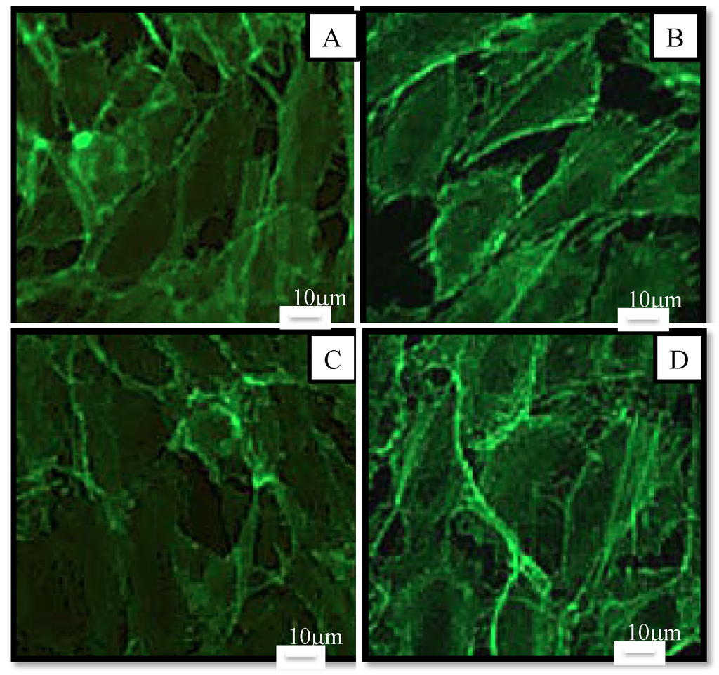 To study the morphological effects at 10 µM (our maximum non-toxic concentration in MTT), cells were stained and observed by fluorescence microscopy (Figure 6). Results showed that there was no noticeable difference in morphology. Cells had the same elongated shape as the control. According to Nagaraj et al. [], the mechanism of toxicity of astaxanthin is dual: an increase in the permeability of the membrane and an interaction with microtubules resulting in the blockage of the mitotic cycle for high concentrations (>40 µM). Therefore, the absence of morphological changes of HUVEC at 10 μM confirmed the absence of toxicity of astaxanthin at this concentration.