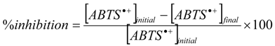 Then, the percentage of inhibition was plotted versus the antioxidant concentration. The TEAC corresponds to the Trolox concentration having the same antioxidant activity as the considered sample. To calculate TEAC, we plotted the curves of the inhibition degree of Trolox and of the sample, then we divided the slopes of the curves by the Trolox curve slope. The TEAC coefficient, being a slope ratio, is unitless. We can report this value for the initial mass of products, pure or natural mixtures, in mmol Trolox/g. The TEAC was evaluated at different times.