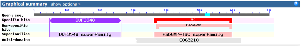 Functional domain analysis of shark TBC1D15. Shark TBC1D15 contains two domains, one from the DUF3548 superfamily and the other from the Rab-GAP-TBC superfamily. The DUF3548 domain is located in the APSL segment.