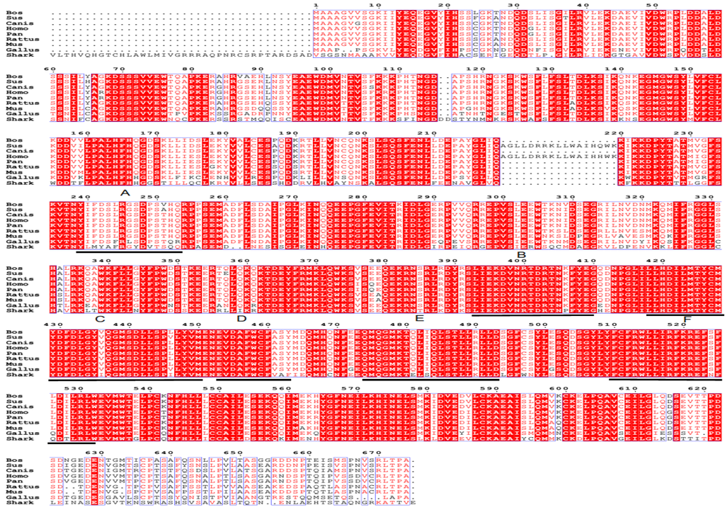 Alignment of the deduced amino acid sequence of the shark TBC1D15 with other homologous proteins. The sequential order of sequence alignment for the TBC1D15 homologs from nine species are as follows: Bos, Sus, Canis, Homo, Pan, Rattus, Mus, Gallus, and Shark. Six motifs (A–F) are underlined.