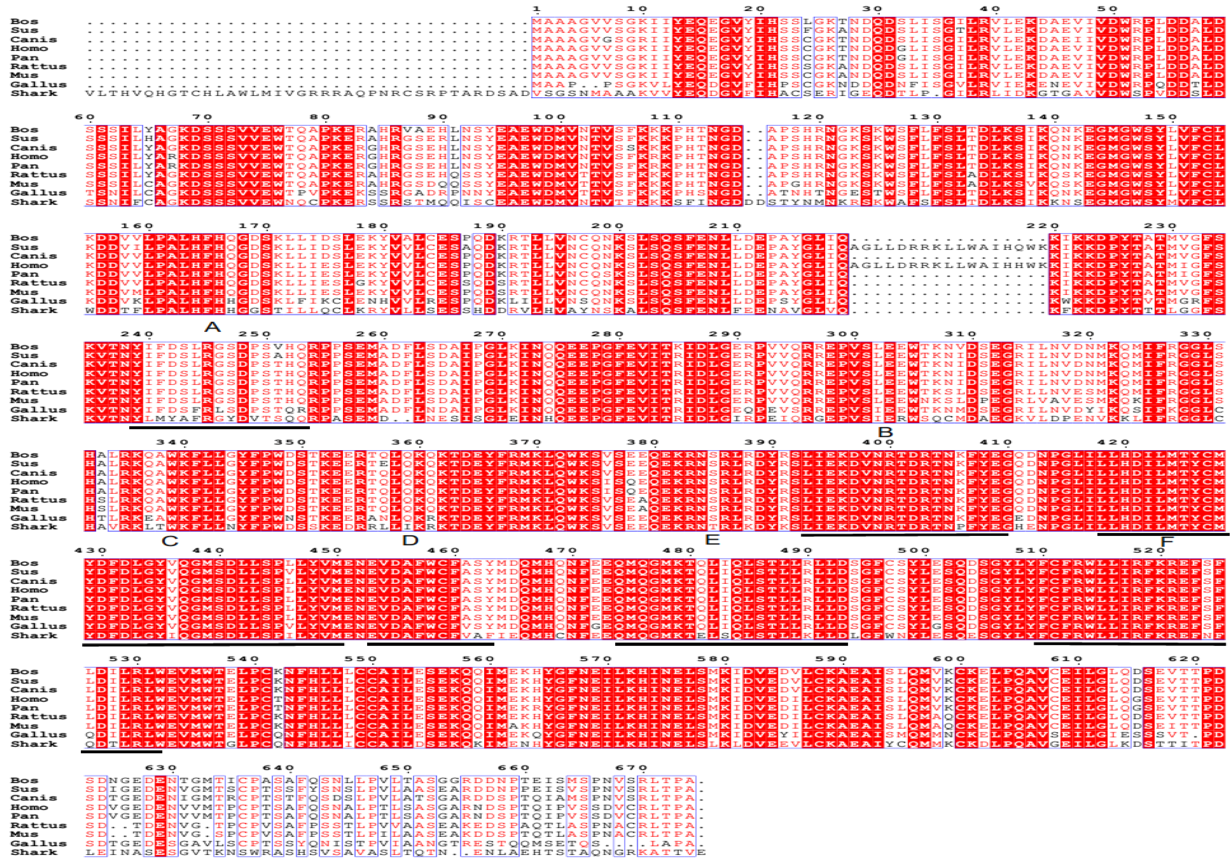 Based on the sequence homology, six typical sequence motifs (A–F) are present in shark TBC1D15; they are found in all members of the TBC1D15 family [12,14] and are highly conserved. Some residues of TBC1D15 are strictly conserved, such as Arg245 in motif A and Arg400 in motif B [14]. Consequently, we concluded that the novel gene we found in regenerating shark liver belongs to the TBC1D15 family. The results from the comparisons of homologous sequences and the six motif sites are shown in Figure 2.