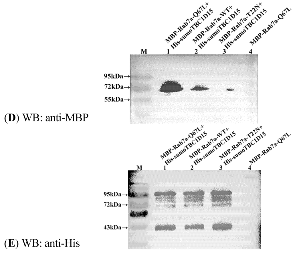 Protein interaction assays in vitro were performed after purification of the MBP and His fusion proteins. The samples were dialyzed to remove imidazole from the purified His fusion protein. For each group of experiments, 800 μL (150 μg) of His-TBC1D15 fusion proteins (bait protein) were added to pre-equilibrated Ni-NTA agarose and the beads were incubated at 4 °C. After approximately 1 h, the flow-through was collected, labeled “bait flow-through”, and placed on ice. The beads were washed with His-buffer A five times, and the flow-through was collected and labeled “bait wash”. Then, the MBP-Rab7-WT/T22N/Q67L (prey protein, 30 µg) was mixed with Ni-NTA agarose bound to His-sumo-TBC1D15 and incubated at 4 °C for 2 h. The flow-through was collected, labeled “prey flow-through”, and placed on ice. Next, the beads were washed five times with His-buffer A, and the flow-through was collected and labeled “prey wash”. Eventually, the proteins were eluted with high-imidazole buffer and prepared for separation by gel electrophoresis using two 12% SDS-PAGE gels. The proteins were separately transferred from the gels to PVDF. The prey MBP fusion proteins were detected using a polyclonal antibody against MBP (Proteintech, Wuhan, China), and the His fusion proteins were detected using a polyclonal antibody against His (Proteintech, Wuhan, China).