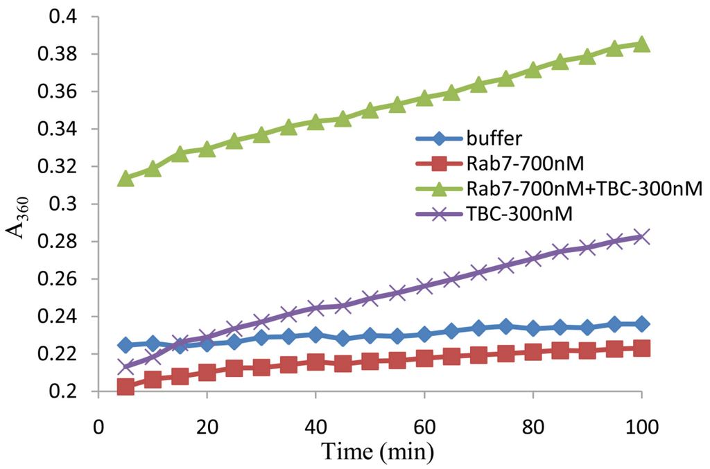 GTPase activity assays were carried out according to the instructions of the EnzChek® Phosphate Assay Kit (Invitrogen E6646, Eugene, OR, USA), which provides a fast and sensitive spectrophotometric method for the continuous detection of phosphate released in enzymatic reactions. In brief, 10 μL each of the purified Rab7 (700 nM) and TBC1D15 (300 nM) fusion proteins were mixed in a 1 mL reaction volume, which contained 50 μL of 20× reaction buffer, 200 μL of MESG substrate solution, 10 μL of purine nucleoside phosphorylase (1 U) and 720 μL of ddH2O. After incubation at 22 °C for 10 min, 1 μL of 2 mM GTP (Sigma G8877, St. Louis, MO, USA) was added to the above reaction volume and mixed well. Then, the A360 was recorded using a spectrophotometer every 5 min to determine the absorbance of the reaction as a function of time. Finally, 20 μL of buffer (instead of TBC1D15 + Rab7a) was used as a parallel control group.