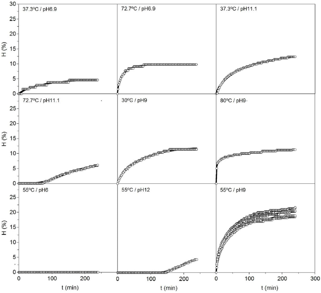 Kinetics of cartilage hydrolysis from Scyliorhinus canicula heads using alcalase in each one of the experimental conditions defined in Table 1. The experimental data (symbols) were fitted to the Weibull Equation (4) (continuous line).