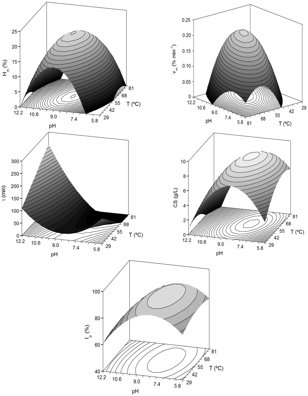 A high proportion of variability (93% for Hm and CS) was successfully described by the second order equations. In any case, the agreement among experimental and predicted data was always greater than 75% and the robustness was good in all cases; it demonstrated the predictive capacity of the empirical equations in the range of T and pH here studied. The results of the multivariate analysis showed significant quadratic negative terms for pH and T (p < 0.05). This translates graphically in a dome (convex surface) with clear maximum points for the experimental domains of pH and T (Figure 2). The inverse response obtained for τ-parameter (concave surface) is in agreement with the fact that when the enzymatic hydrolysis is greater and faster (high Hm and vm), the values of τ are shorter.