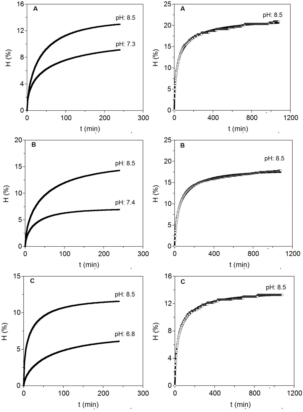 Enzymatic hydrolysis at two pH levels for different cartilages from S. canicula wastes (left). To the right, long hydrolysis at the best pH selected are additionally shown. Experimental data were fitted to the Weibull Equation (4). (A) Fins; (B) Heads and (C) Skeletons.