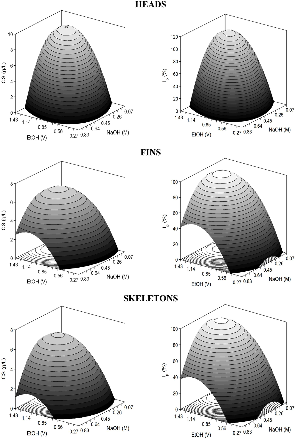 Based on the optimised values described in the previous sections, the hydrolysates of cartilages from different origins (heads, skeletons and fins) were prepared under the following conditions: Hydrolysis time (10 h), T = 58 °C, pH = 8.5 (using Tris-HCl buffer 0.1 M), alcalase = 0.1% (v/w) (2.4 AU/kg), solid:liquid ratio (1:1), agitation = 200 rpm. The alcalase hydrolysates were centrifuged at 6000 rpm/20 min and the supernatants were employed in the subsequent treatment with alkaline hydroalcoholic solutions, as described here in the Experimental Section.
