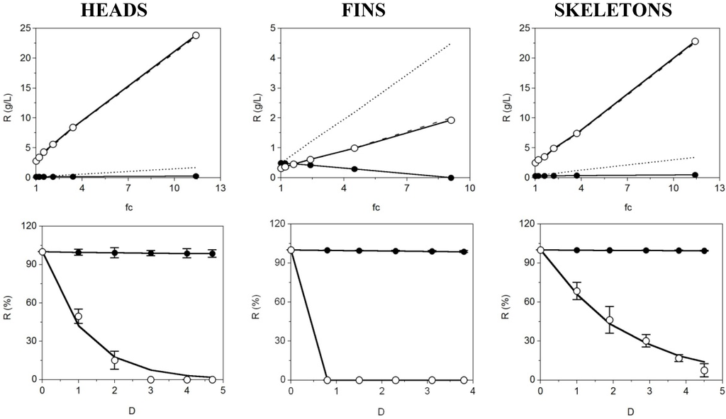 where, R is the concentration of permeable protein or CS in the retentate (% from the level at initial DF), R0 is the permeate concentration (%), Rf is the asymptotic and retentate concentration (%), D is the relative diavolume (volume of added water/constant retentate volume) and s is the specific retention of protein or CS with variation between 0 (the solute is filtered as the solvent) and 1 (the solute is totally retained). Thus, using normalized values (%): R0 + Rf = 100, with R0 = 0 if all protein or CS are permeable. In addition, the percentage of protein or CS eliminated by three diavolumes (R3D) was calculated by substituting in Equation (6) the value of parameter D by 3.