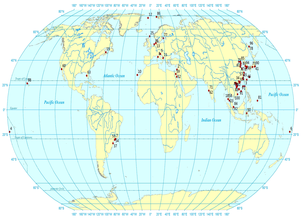 Marine fungi are an ecologically rather than physiologically or taxonomically defined group of organisms [1]. Marine fungi are parasitic or saprophytic in other marine organisms or materials. We collected 117 peer-reviewed research articles regarding antibacterial or antifungal compounds from marine fungi from January 2010 to March 2015. Most of the sites shown in Figure 1 are approximate locations based on the information about the marine material samplings in the literature and the other sites plotted by their exact latitude and longitude (details shown in Supplementary Table S1). There are 17 literature reports without collection locale information, and they are not included in Figure 1. According to Figure 1, most of the materials for fungal isolation were obtained near the coastal area of Eurasia, and more than a half of the marine materials are from the coastal area near China. Many natural products are used as medicines in China, and the Chinese people are traditionally keen on the discovery and development of natural medicines.