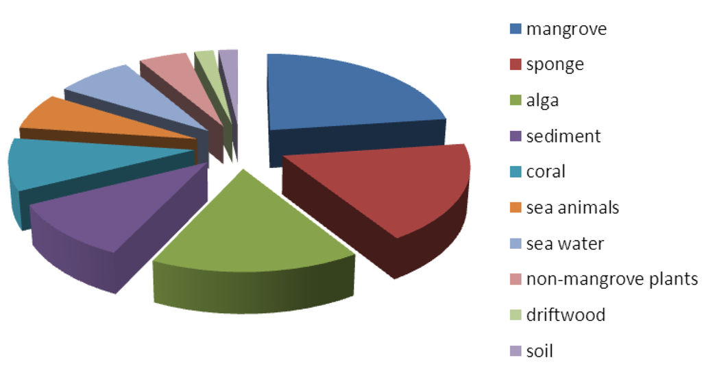 Many different types of marine materials were collected for the fungal isolations. According to the literature, there are 105 marine fungal strains used for the isolation of antibacterial or antifungal compounds. These 105 marine fungal strains were isolated from marine materials, which are divided into 12 classes as shown in Figure 2.