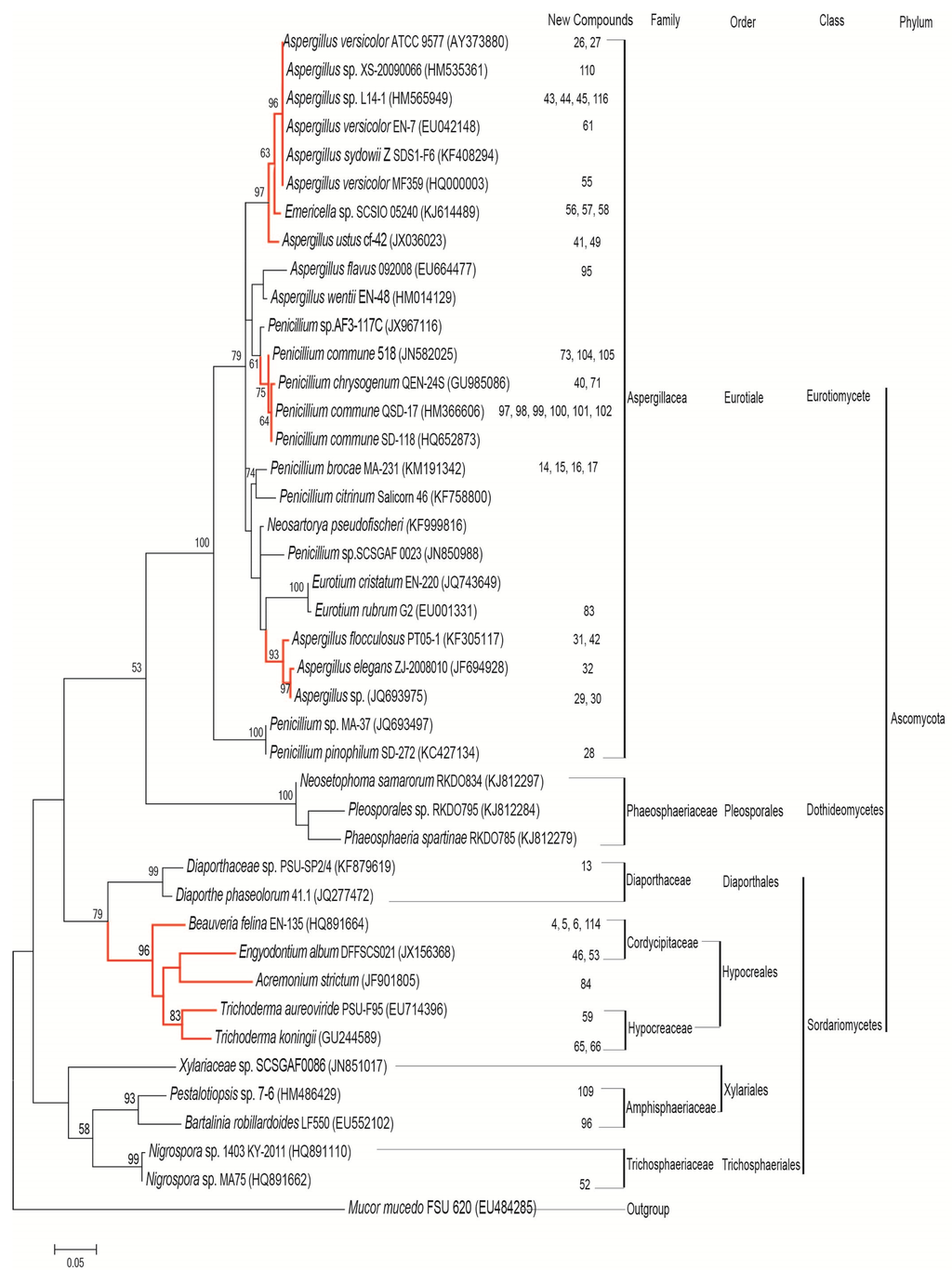 To obtain an overview of the phylogenetic relationship among the marine fungi that produce antibacterial or antifungal compounds, we analyzed the internal transcribed spacer (ITS) data sets of 41 sequences from marine fungi with antibacterial or antifungal activities. Originally, 49 fungal DNA sequences were collected from the 117 literature reports. Eight of these sequences were calmodulin, tubulin or 18S ribosomal RNA genes, and the rest were the 41 ITS sequences used for phylogeny analysis. The ITS sequences were aligned by ClustalW implemented in BIOEDIT ver. 7.0.5 [11], and optimized manually using BIOEDIT. Maximum likelihood (ML) analysis was constructed using the Kimura 2-parameter (K2) nucleotide substitutions model as selected by MEGA6 [12]. A ML tree was generated using MEGA6 with bootstrap values calculated from 100 replicates (Figure 3). The phylogenetic tree was rooted with the Mucor mucedo ITS sequence (shown in Figure 3).