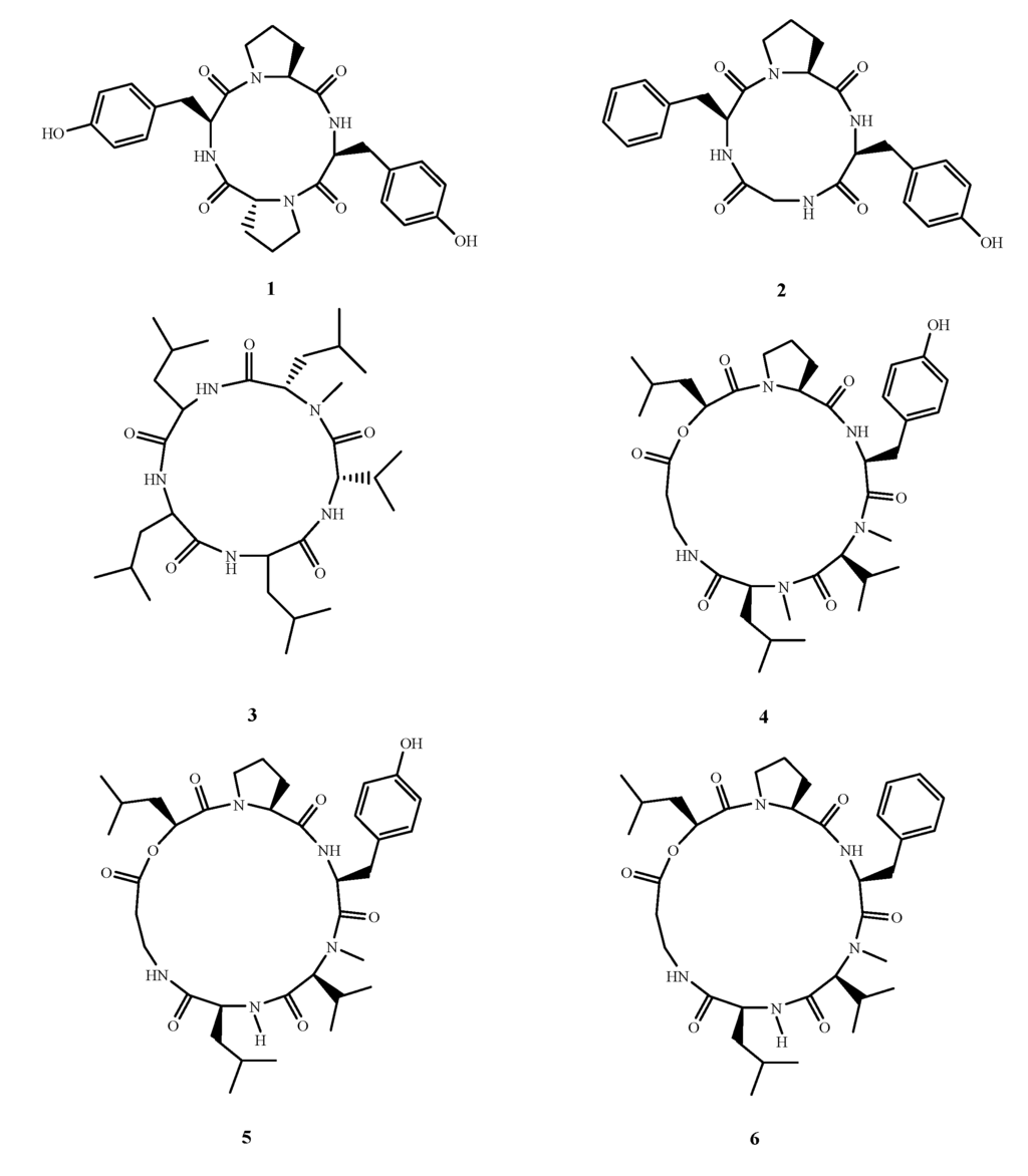 Cyclopeptides from terrestrial microorganisms are considered a good antimicrobial source. However, only six new antimicrobial cyclopeptides, 1–6 (Figure 4), were isolated from three marine fungi. Two cyclotetrapeptides (d-Pro-l-Tyr-l-Pro-l-Tyr) (1) and (Gly-l-Phe-l-Pro-l-Tyr) (2), were isolated from the co-culture broth of mangrove fungi Phomopsis sp. K38 and Alternaria sp. E33 [13]. Compound 2 showed stronger activity (MIC, 25–250 μg/mL) than 1 (35–400 μg/mL) against five tested fungi. Cyclopentapeptide lajollamide A (3) was isolated from Asteromyces cruciatus 763. Natural lajollamide A (3), which is a mixture of several stereochemical configurations, has only weak antibacterial activity against Bacillus subtilis and Staphylococcus epidermidis [14]. However, the absolute configuration of lajollamide A (3) (leucine residues 1–3: d-Leu-l-Leu-l-Leu), which was solved by total synthesis, was more active than natural lajollamide A (3). This indicates that the diastereomers of the Leu-Leu-Leu moiety effectively impact the antibacterial activity. Isaridin G (4), desmethylisaridin G (5) and desmethylisaridin C1 (6) are three new cyclohexadepsipeptides of the isaridin class that were isloated from Beauveria felina EN-135. These compounds showed inhibitory activity against Escherichia coli (MIC, 64, 64 and 8 μg/mL, respectively) and this is the first report of antibacterial activity of the isaridins [15].