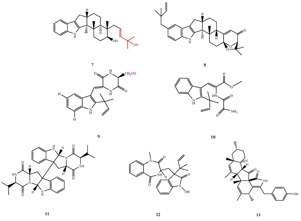 Ten new indole-alkaloids, 7–12 and 14–17 (Figure 5 and Figure 6), showed antibacterial activities and most were isolated from marine fungi belonging to Aspergillus and Penicillium genera. The 4-hydroxy-4-methylpent-2-enyl moiety (red group shown in the chemical structure of 7) in asporyzin C (7), which was isolated from A. oryzae was deduced to be necessary for antibacterial activity against E. coli [16]. Compound 8 was isolated from A. flavus OUCMDZ-2205, which exhibited stronger activity against Staphylococcus aureus (MIC, 20.5 μM) than did the known analog, β-aflatrem from the same fungal strain [17]. Cristatumins A (9), D (10) and E (11) were isolated from Eurotium cristatum EN-220 (9 and 10) and E. herbariorum HT-2 (Eurotium sp. is sexual state of Aspergillus sp.) [18,19]. These three compounds displayed bacterial inhibitory activity. Cristatumin A (9) exhibited activity against E. coli and S. aureus (MIC, 64 μg/mL) and cristatumin D (10) showed weak activity against S. aureus with an inhibition zone (IZ) of 8 mm at 100 μg/disk. Cristatumin E (11) exhibited antibacterial activity against Enterobacter aerogenes and E. coli (MIC, 44.0 and 44.0 μM, respectively). By comparison to known compound neoechinulin A, the antibacterial activity of 9 appears related to the hydroxyl moiety on C-20. Compound 12 was also isolated from an Aspergillus sp. and exhibited potent activity against Vibrio spp. (MIC, 0.1 and 1 μg/mL) [20]. Diaporthalasin (13), which was isolated from Diaporthaceae sp. PSU-SP2/4, displayed significant antibacterial activity against both S. aureus and methicillin-resistant S. aureus (MRSA) with equal MIC values of 2 μg/mL [21].