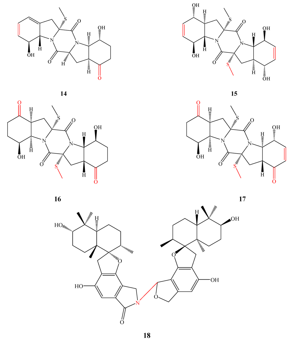 Penicibrocazines B–E (14–17) (Figure 6) were produced by P. brocae MA-231. Compounds 14–16 showed antibacterial activity against S. aureus (MIC, 32.0, 0.25 and 8.0 μg/mL, respectively) and compounds 14, 16 and 17 showed antifungal activity against Gaeumannomyces graminis (MIC, 0.25, 8.0 and 0.25 μg/mL, respectively). By comparison with the known compound Penicibrocazine A lacking antimicrobial activity, the double bonds at C-6 and C-6′ increased activity against S. aureus and more S-methyl groups likely strengthened activity against G. graminis. In addition, the keto groups at C-5/5′ enhanced the activity against G. graminis [22]. Stachyin B (18) was isolated from Stachybotrys sp. MF347 and showed activity against three Gram-positive bacterial strains MRSA, B. subtilis and S. epidermidis (IC50, 1.75, 1.42 and 1.02 μM, respectively) but no activity against the Gram-negative test strain and the fungal strains. Stachyin B (18) is the first dimeric spirodihydrobenzofuranlactams with N–C linkage (red color shown in the below structure) and its analogs (the other dimeric spirodihydrobenzofuranlactams) are N–N linkage instead. This N–C linkage is important for its antibacterial activity, as determined by comparison of the activity of stachyin B (18) with other N–N connected analogs (other dimeric spirodihydrobenzofuranlactams) and stachyin A (a single spirodihydrobenzofuranlactam) [23].