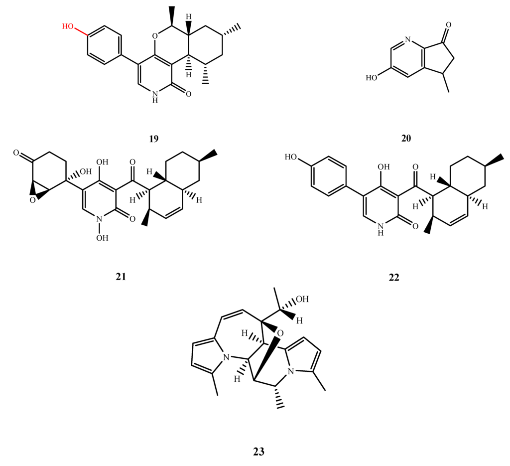 The structures of compound 19–23 were shown in Figure 7. Trichodin A (19) was isolated from Trichoderma sp. MF106 and showed antibacterial activity against Gram-positive B. subtilis and S. epidermidis (IC50, 27.05 and 24.28 µM, respectively) and antifungal activity against Candida albicans (IC50, 25.38 μM) [24]. However, trichodin B, which substituted a ribofuranose group for the C-20 hydroxyl of 19, showed no activity against any test microorganisms. Compound 20 was isolated from Wallemia sebi PXP-89 and was elucidated to be 5,6-dihydro-3-hydroxy-5-methylcyclopenta[b]pyridin-7-one with weak antibacterial activity against E. aerogenes (MIC, 76.7 µM) [25]. Didymellamides A (21) and B (22) were isolated from Stagonosporopsis cucurbitacearum. Didymellamide A (21) inhibited three strains of Candida spp. (MIC, 3.1 μg/mL) and Cryptococcus neoformans (MIC, 1.6 μg/mL). Didymellamide B (22) only inhibited C. neoformans (MIC, of 6.3 μg/mL) [26]. Curvulamine (23) was isolated from Curvularia sp. IFB-Z10 as a compound with a novel carbon skeleton and showed antibacterial activity against Veillonella parvula, Streptococcus sp. Bacteroides vulgatus and Peptostreptococcus sp. with an MIC value of 0.37 μM for all species. Curvulamine (23) has more selective antibacterial activity than tinidazole and is biosynthetically unique with a new extension formed through a decarboxylative condensation between an oligoketide motif and an alanine [27].