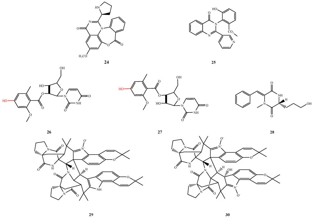 The structures of compound 24–30 were shown in Figure 8. Aspergicin (24) was isolated from the co-culture of Aspergillus sp. FSY-01 and Aspergillus sp. FSW-02 and exhibited moderate antibacterial activity against S. aureus (MIC, 62.50 μg/mL), S. epidermidis (MIC, 31.25 μg/mL), B. subtilis (MIC, 15.62 μg/mL), B. dysenteriae (MIC, 15.62 μg/mL), B. proteus (MIC, 62.50 μg/mL) and E.coli (MIC, 31.25 MIC μg/mL) [28]. Terremides B (25), a pyrimidinone derivative, was isolated from A. terreus PT06-2 and showed weak activity against E. aerogenes (MIC, 33.5 μM) [29]. Two aroyl uridine derivatives kipukasins H (26) and I (27), were isolated from A. versicolorstrain ATCC 9577 and exhibited antibacterial activity against S. epidermidis (MIC, 12.5 μM). Their methylated derivatives (methoxyl substituted for C-4″ hydroxyl) were inactive against the test bacterial strain, which indicated that the hydroxyl at C-4″ may have a positive contribution to the antibacterial activity [30]. Pinodiketopiperazine A (28), a diketopiperazine derivative, was isolated from P. pinophilum SD-272 and displayed inhibitory activity against E. coli (IZ, 10 mm at 20 μg/disk) [31]. Two novel structural skeletons, compounds 29 and 30, were isolated from an Aspergillus sp. after screening over two thousand fungal strains. Waikialoid A (29) and waikialoid B (30) demonstrated dose-dependent activity in the biofilm inhibition assay against C. albicans with IC50 values of 1.4 and 46.3 μM, respectively. Although waikialoid A (29) was unable to disrupt preformed biofilms, by microscopy studies, it inhibited cell adherence, hyphal development, and biofilm assemblies during the early stages of surface colonization, and it was not cytotoxic to human cells [32].
