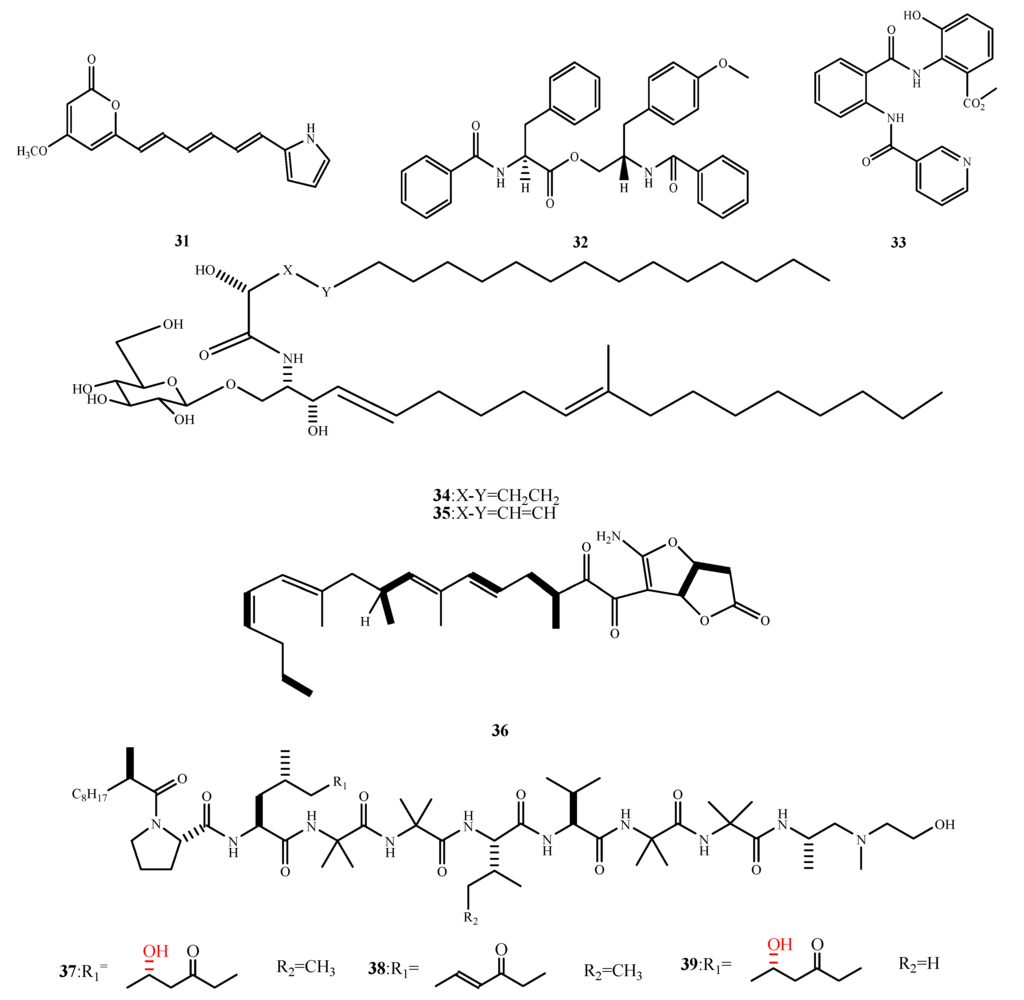 The structures of compound 31–39 were shown in Figure 9. Compound 31 was only produced by A. flocculosus PT05-1 under high salt stress conditions and showed antibacterial activity against E. aerogenes (MIC, 3.7 μM) [33]. Compound 32 was elucidated to be 4′-methoxyl-asperphenamate and was isolated from A. elegans ZJ-2008010. It showed a similar activity as asperphenamate against S. epidermis (MIC, 10 μM) [34]. Terremide A (33) was isolated from A. terreus PT06-2 and showed weak activity against S. aureus (MIC, 63.9 μM) [29]. Two cerebrosides, flavuside A (34) and flavuside B (35), were isolated from A. flavus. They exhibited 15.6 and 31.2 μg/mL MICs for S. aureus and MRSA [35]. Compound 36 was isolated from Paecilomyces sp. and exhibited weak activity against MRSA [36]. Trichoderin A (37), trichoderin A1 (38) and trichoderin B (39) were isolated from fungal strain 05FI48 and they exhibited potent antibacterial activity against M. smegmatis, M. bovis BBG and M. tuberculosis H37Rv (MIC, 0.1, 0.02 and 0.12 μg/mL for 37; 1.56, 0.16 and 2.0 μg/mL for 38; 0.63, 0.02 and 0.13 μg/mL for 39) [37,38]. Based on the comparison of the structures and activities of 37–39, the R1 hydroxyls (the red moiety shown in the structure 37 and 39) of 37 and 39 are related to their antibacterial activity. The mechanism of 37 was investigated using a transformant of M. smegmatis with resistance to 37. This M. smegmatis transformant over-expressed part of the genes that encoded the mycobacterial ATP synthase, indicating that the anti-mycobacterial activity of 37–39 is related to the inhibition of ATP synthesis.