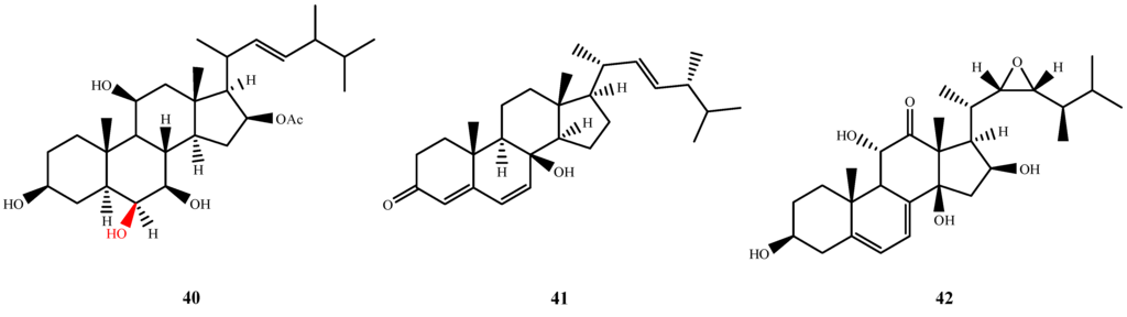 Three new steroids with antimicrobial activity, 40–42 (Figure 10), were isolated from P. chrysogenum QEN-24S, A. ustus cf-42 and A. flocculosus PT05-1, respectively. Penicisteroid A (40) exhibited antifungal activity against A. niger and Alternaria brassicae (IZ, 24 mm and 16 at 20 μg/disk) [39]. The C-6 hydroxyl group may contribute to its activity, as determined by comparison with known compound anicequol (C-6 carbonyl group). Isocyathisterol (41) showed antibacterial activities against E. coli and S. aureus (IZ, 6.7 and 5.7 mm at 30 μg/disk, respectively) [40]. Compoud 42 was produced only under the high salinity conditions (10% salinity addition in fermentation) and exhibited antimicrobial activities against S. aureus, E. coli, and A. niger (MIC, 3.3, 3.3 and 1.6 μM, respectively) [33].