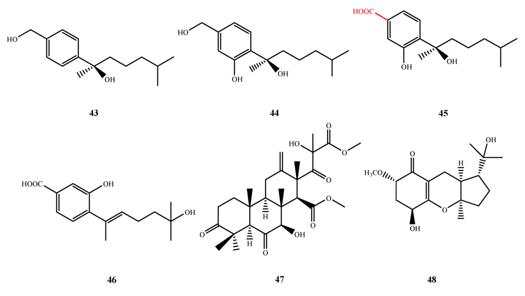 Five new antimicrobial sesquiterpenoids, 43–47 (Figure 11), were isolated from Aspergillus sp. ZJ-2008004 (43–45), Leucostoma persoonii (46), Aspergillus sp. OPMF00272 (47) and Scyphiphora hydrophyllacea A1 (44). Aspergiterpenoid A (43), (−)-sydonol (44) and (−)-sydonic acid (45) showed activity against E. coli and Micrococcus tetragenus (MIC, 20 and 10 μM for 43; 20 and 1.25 μM for 44; and 5 and 20 μM for 45) [41]. Furthermore, compound 45 showed activity against other four test bacteria B. subtilis (MIC, 2.5 μM), Sarcina lutea (MIC, 2.5 μM), V. parahaemolyticus (MIC, 10 μM) and V. anguillarum (MIC, 5 μM), that 39 and 40 were inactive against. The C-4 carboxyl of 45 was important for the activtiy. Engyodontiumone I (46) displayed antibacterial activity against B. subtilis (MIC, 256.0 μg/mL) [42]. Terretonin G (47), a new meroterpene, showed activity against Gram-positive bacteria S. aureus, B. subtillis and M. luteus(IZ, 4, 2 and 2 mm at 20 μg/disk, respectively), but not against the Gram-negative test bacteria and fungi [43]. Guignardones I (48) (Figure 11), another new meroterpene, exhibited antibacterial activity toward MRSA and S. aureus (IZ, 3 and 5 mm at 1 µg/disk, respectively) [44].