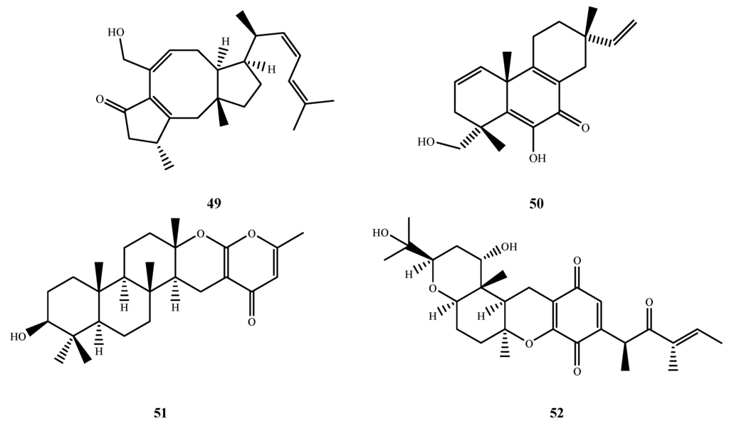 The structures of compound 49–52 were shown in Figure 12. Sesterterpene ophiobolin U (49) was isolated from fresh A. ustus cf-42 and exhibited inhibitory activities against E. coli and S. aureus (IZ, 15 and 10 mm at 30 μg/disk, respectively) [45]. Libertellenone G (50) was isolated from Eutypella sp. D-1 and showed antibacterial activity against E. coli, B. subtilis and S. aureus (IZ, 8, 8 and 9 at 50 μg/disk) [46]. Chevalone E (51) was isolated from A. similanensis sp. nov. KUFA 0013, which was found to show synergism with the antibiotic oxacillin against methicillin-resistant S. aureus (MRSA) [47]. Compound 52 was only produced by Nigrospora sp. MA75 in medium with 3.5% NaI and exhibited activity against MRSA (MIC, 8 µg/mL), E. coli (MIC, 4 μg/mL), P. aeruginosa (MIC, 4 µg/mL), P. fluorescens (MIC, 0.5 µg/mL) and S. epidermidis (MIC, 0.5 µg/mL), which implies that the added iodide ion may be triggering the activation of a mixed polyketide terpenoid biosynthetic pathway in this fungal strain [48].