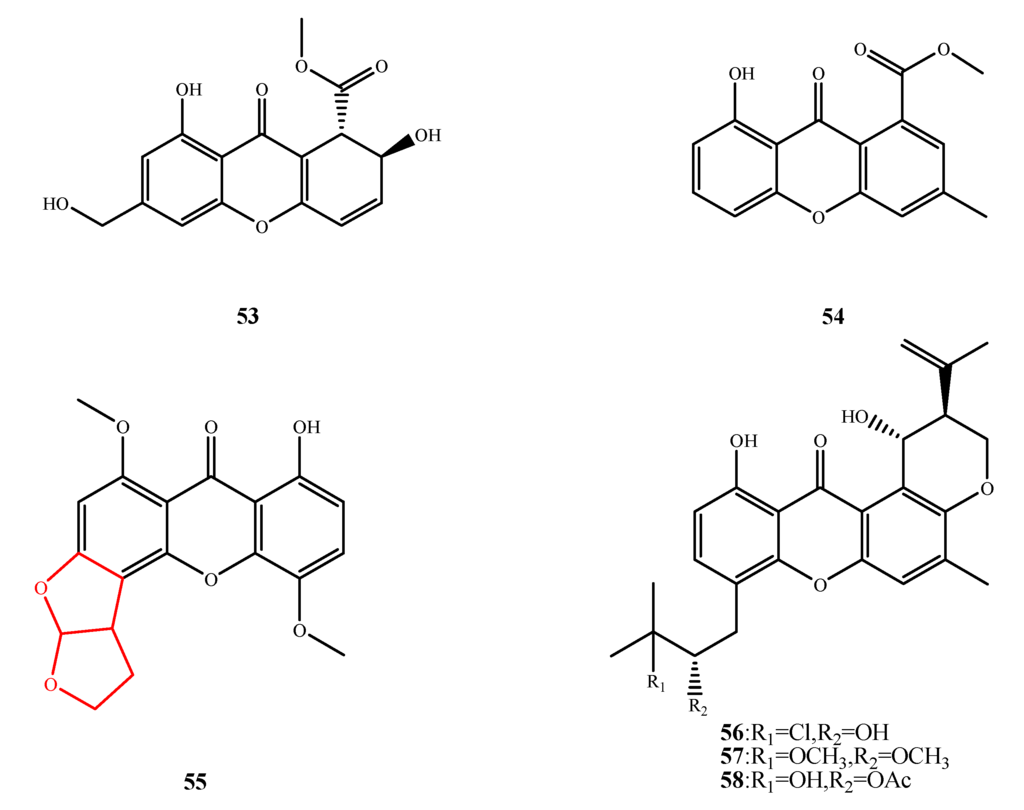 The structures of compound 53–58 were shown in Figure 13. Six antimicrobial xanthones were isolated and their structures were elucidated. Engyodontiumone H (53) produced by Engyodontium album DFFSCS021 exhibited activity against E. coli (MIC, 64 µg/mL) and B. subtilis (MIC, 32 µg/mL) [42]. Compound 54 was isolated from the co-culture of unidentified strains E33 and K38 and exhibited activity against five flimantous fungal strains, Gloeasporium musae, Blumeria graminearum, Fusarium oxysporum, Perononphthora cichoralearum and Colletotrichum glocosporioides (respective inhibition rates of 53%, 4.6%, 9.5%, 48% and 28% at 100 µg/mL) [49,50]. Compound 55 was isolated from A. versicolor MF359 and showed significantly stronger activity against S. aureus (MIC, 12.5 μg/mL) and B. subtilis (MIC, 3.125 μg/mL) than 53 and 54 [51]. This difference implies that the two furan rings are most likely related to its antibacterial activity. Emerixanthones A (56), emerixanthone C (57) and emerixanthone D (58) isolated from Emericella sp. SCSIO 05240. Emerixanthones A (56) and emerixanthones C (57) exhibited antibacterial activity (IZ, 4–6 mm at 1.25 µg/disk) against all test bacteria E. coli, Klebsiella pneumonia, S. aureus, Enterococcus faecalis, Acineto bacterbaumannii and Aeromonas hydrophila. Emerixanthones D (58) showed an inhibitory zone of 3–4 mm against the fungal test phytopathogen Fusarium sp., Penicillium sp., A. niger, Rhizoctonia solani, F. oxysporium f. sp. niveum and F. sporium f. sp. cucumeris [52].