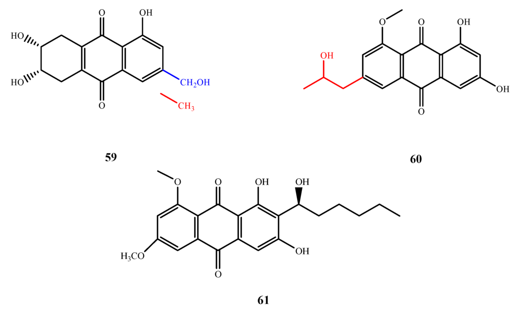 The structures of compound 59–61 were shown in Figure 14. Trichodermaquinone (59) was isolated from T. aureoviride PSU-F95 and exhibited antibacterial activity against MRSA (MIC, 200 μg/mL). Compound 59 with a C-3 hydroxymethyl group (blue moiety in the structure of 59) showed significantly weaker activity than coniothranthraquinone, a known compound produced by the same fungal strain with a C-3 methyl group (red moiety in the structure of 59) (MIC, 8 μg/mL) [53]. Isorhodoptilometrin-1-methyl ether (60) was isolated from A. versicolor and exhibited antibacterial activity against three Gram-positive bacterial strains B. cereus, B. subtilis and S. aureus (IZ, 2, 3 and 5 mm at 50 µg/disk, respectively) [54]. The C-6 propanol group of 60 is important for its activity, as determined by comparison with inactive compound 1-methyl emodin. Compound 61 was isolated from A. versicolor EN-7 and exhibited antibacterial activity against E. coli (IZ, 7 mm at 20 μg/disk) [55].