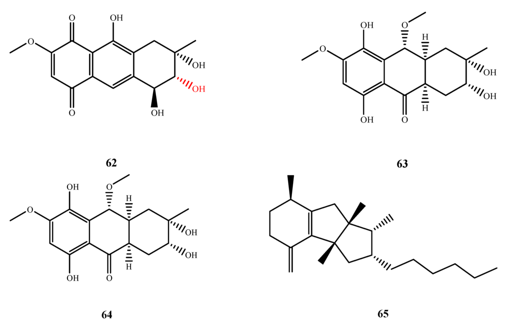 The structures of compound 62–65 were shown in Figure 15. Anthraquinone derivatives, 62 and 63, were isolated from Nigrospora sp. No. 1403. Compound 62 exhibited potent activity against B. subtilis (MIC, 0.625), B. cereus (MIC, 10.0), M. luteus (MIC, 20.0 µM), S. albus (MIC, 5.00 µM), S. aureus (MIC, 2.50 µM), M. teragenus (MIC, 1.25 µM), E. coli (MIC, 2.50 µM), V. anguillarum (MIC, 2.50 µM) and V. parachemolyticus (MIC, 1.25 µM). Compound 63 was from the same fungal strain, but its antibacterial activity was significantly weaker than 62 [56]. From comparison of several known anthraquinone derivatives, the hydroxyl groups of 62 at C-4 and C-9 have little effect on the antibacterial activity but the hydroxyl group of 62 at C-3 most likely contributes to its antibacterial activity [56,57]. Seimatorone (64) was isolated from Seimatosporium sp. No. 8883 and showed antibacterial activity against E. coli and B. megaterium (IZ, 3 and 7 mm at 50 μg/disk, respectively) [58]. Trichodermaketone A (65) was from T. koningii and exhibited synergistic antifungal activity against C. albicans at 125 µg/mL with 0.05 µg/mL ketoconazole [59].