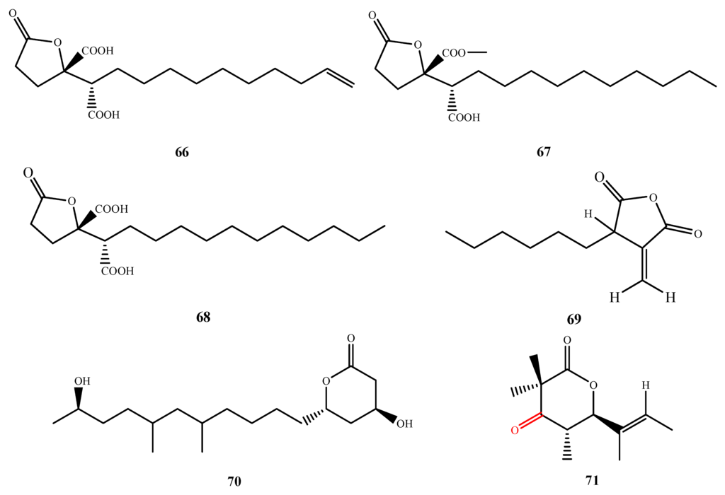 The structures of compound 66–71 were shown in Figure 16. The structures of three new antimicrobial butenolides were elucidated from two Aspergillus spp. Spiculisporic acids B–D (66–68) were isolated from Aspergillus sp. HDf2 and exhibited a similar weak antibacterial activity against S. aureus [60]. Tubingenoic anhydride A (69), which was isolated from A. tubingensis OY907, inhibited Neurospora crassa growth (MIC, 330 μM) and affected hyphal morphology. Compound 69 may affect cell wall biosynthesis through a cytosolic protein that is the product of the new gene mas-1, originally characterized from the N. crassa mutant with tolerance to 69 [61]. Penicitide A (70) was purified from P. chrysogenum QEN-24S and displayed activity against A. brassicae (IZ, 6 mm at 20 μg/disk) [62]. Helicascolide C (71) was isolated from Daldinia eschscholzii KT32 and showed antifungal activity against phytopathogenic fungus Cladosporium cucumerinu (IZ, 5 mm at 200 μg/disk) [63]. By comparison to known compound helicascolide A, the C-3 keto group of 71 (the red moiety shown in the structure of 71) enhances the antifungal activity.
