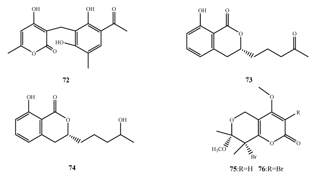 The structures of compound 72–76 were shown in Figure 17. Communol A (72) was isolated from P. commune 518 and showed weak antibacterial activity against E. coli and E. aerogenes (MIC, 4.1 μM and 16.4 μM, respectively) [64]. Aspergillumarin A (73) and B (74) were isolated from Aspergillus sp. and exhibited weak activities against S. aureus and B. subtilis at 50 µg/mL [65]. Bromomethylchlamydosporols A (75) and B (76) were isolated from Fusarium tricinctum. The addition of CaBr2 to the fermentation media resulted in the production of two halogenated chlamydosporol analogs, 75 and 76. Compounds 75 and 76 showed the same activity against three strains of S. aureus (MIC, 15.6 µg/mL) [66].