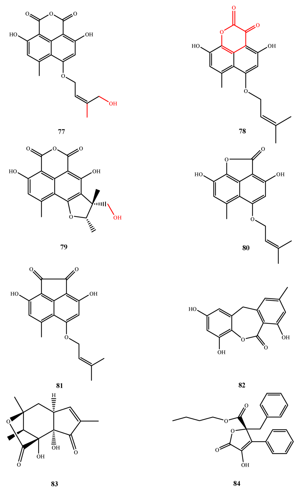 The structures of compound 77–84 were shown in Figure 18. Three tricyclic lactones and one tetracyclic lactone with antimicrobial activities were isolated from Coniothyrium cereale (Z)-coniosclerodinol (77), conioscleroderolide (78), (15S,17S)-(−)-sclerodinol (79) and coniolactone(80), repectively. Moreover, coniosclerodione (81), with activity against S. aureus (MIC, 65.7 μM) as well as Micrococcus luteus and Mycobacterium phlei (IZ, 10 and 12 mm at 20 μg/disk, respectively),was isolated from the same fungal strain [67]. By comparison with its analogs, the activity against M. phlei. (IZ, 16 mm at 20 μg/disk) of 77 is related to its C-18 hydrogens and C-19 hydroxyl. Moreover, antibacterial activity seems to correlate with the presence of a diketo-lactone ring as found in compound 78. The C-19 hydroxyl of 79 is also important for its activity against M. phlei (IZ, 20 mm at 20 μg/disk). Compound 82 was isolated from E. rubrum G2 and elucidated as 9-dehydroxyeurotinone with weak antibacterial activity against E. coli (IZ, 7 mm at 100 mg/disk) [68]. Acremostrictin (83) is another tricyclic lactone that was isolated from A. strictum,and it exhibited weak activity against M. luteus, Salmonella typhimurium and Proteus vulgaris (MIC, 50, 50 and 12.5 μg/mL, respectively) [69]. Flavipesin A (84) was isolated from A. flavipes AIL8 and demonstrated antibacterial activity against S. aureus (MIC, 8.0 μg/mL) and B. subtillis (0.25 μg/mL). Flavipesin A (84) also demonstrated activity against biofilm formation and could penetrate the mature biofilm matrix to kill the cell. Even penicillin cannot penetrate the polysaccharide barriers of a mature biofilm [70].