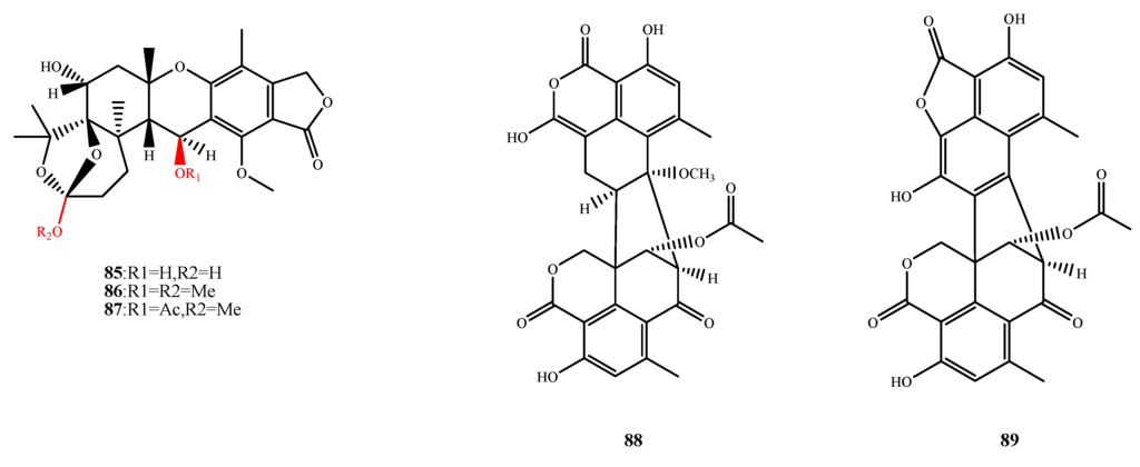 The structures of compound 85–89 were shown in Figure 19. Austalide R (85), M (86) and N (87) were isolated from Aspergillus sp. and exhibited antibacterial activity against Halomonas aquamarina, Polaribacter irgensii, Pseudoalteromonas elyakovii, Roseobacter litoralis, Shewanella putrefaciens, V. harveyi, V. natriegens, V. proteolyticus and V. carchariae (MIC, 0.01–0.1 μg/mL for 85; 0.001–0.01 μg/mL for 86 and 0.01 μg/mL for 87). The R1 substituents at C-17 and R2 at C-22 (shown in the structures of 85 and 86) significantly enhance their antibacterial activities [20,71]. Talaromycesone A (88) and B (89) were isolated from Talaromyces sp. LF458 and exhibited potent antibacterial activities against human pathogenic S. epidermidis (IC50, 3.70 and 17.36 μM, respectively) and S. aureus MRSA (IC50, 5.48 and 19.50 μM, respectively) [72].