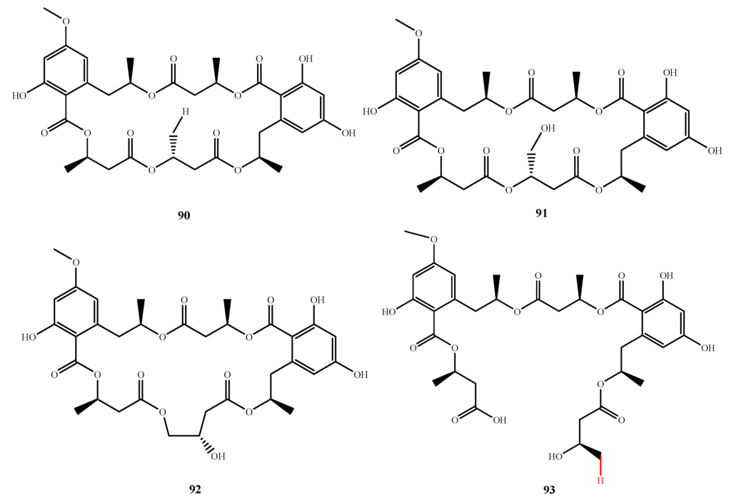 Calcarides A–C (90–92) and E (93) (Figure 20) were isolated from Calcarisporium sp. KF525 and showed antibacterial activity against S. epidermidis and X. campestris (MIC, 68.8 and 5.5 μg/mL for 90; 53.2 and 22.6 μg/mL for 91; 29.6 and 61.4 μg/mL for 92; and 104.3 and more than 150 μg/mL for 93, respectively) [73]. In comparison to calcaride D that contains a hydroxyl, calcaride E (93) exhibited stronger activity with its hydrogen moiety. Three compounds, 6-hydroxymellein, β-hydroxybutyric acid and 6-methoxymellein, were proposed as the precursors of calcaride.