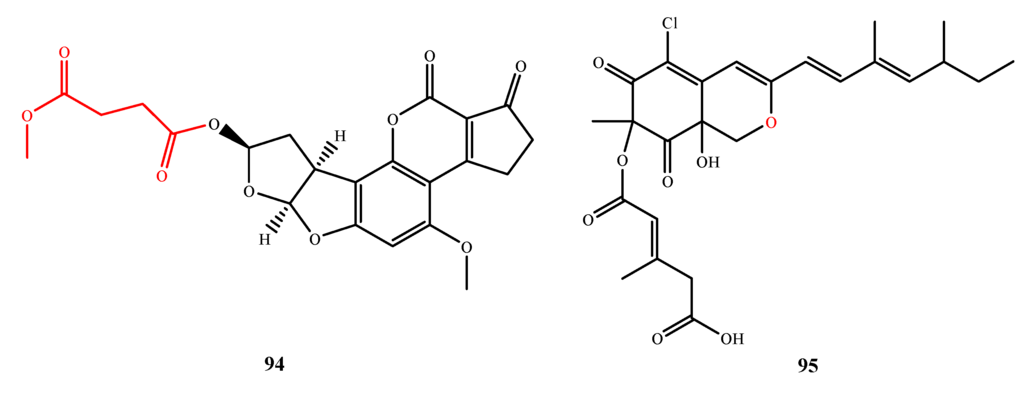 Aflatoxin B2b (94) (Figure 21) was isolated from A. flavus 092008 and exhibited moderate antimicrobial activity against E. coli, B. subtilis and E. aerogenes (MIC, 22.5, 1.7 and 1.1 µM, respectively) [74]. Compound 94 was elucidated to be the 4-methoxy-4-oxobutanoyl substitution for the acetyl group of 8-acetyloxyaflatoxin B1. By comparison to 8-acetyloxyaflatoxin B1, the 4-methoxy-4-oxobutanoyl moiety partly contributes to the antibacterial activity of 94. Moreover, based on aflatoxins B1 and aflatoxins B1, the acetyloxy group of 8-acetyloxyaflatoxin B1 is not related to the antibacterial activity. Isochromophilone XI (95) (Figure 21) was isolated from Bartalinia robillardoides LF550 and showed antibacterial and antifungal activities against B. subtilis, S. lentus and Trichophyton rubrum (MIC, 55.6, 78.4 and 41.5 μM, respectively). The oxygen in the pyran ring of 95 is important for its antibacterial and antifungal activities, as determined by comparison to inactive analogs of 95 [75,76].
