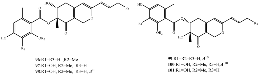 Comazaphilones A–F (96–101) (Figure 22) were isolated from P. commune QSD-17. Comazaphilones C–E (98–100) displayed potent antibacterial activities against S. aureus MRSA, P. fluorescens and B.subtilis (MIC, 16, 64 and 32 μg/mL for 98; 32, 16 and more than 256 μg/mL for 99; and more than 256 μg/mL, 32 and 16 μg/mL for 100, respectively). The SAR results indicated that the double bond at C-10 of 98–100, as well as the location of the orsellinic acid unit at C-6 of 99 and 100 are important for their activity [77].