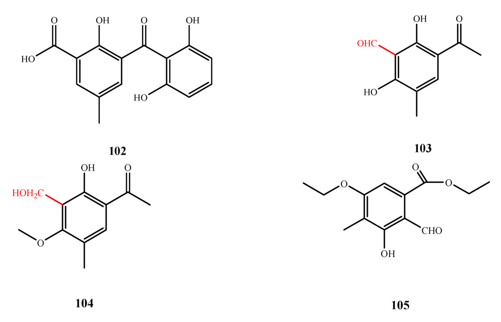 The structures of compound 102–105 were shown in Figure 23. Isomonodictyphenone (102) was isolated Penicillium sp. MA-37 and showed potent antibacterial activity against Aeromonas hydrophilia (MIC, of 8 μg/mL) [78,79]. Communol F (103) and communol G (104) were isolated from P. commune 518 and showed weak antimicrobial activities against E. coli and E. aerogenes (MIC, 6.4 and 25.8 μM for 103; and 23.8 and 23.8 μM for 104, respectively) The CHO moiety of 105 and the CH2OH of 104 at C-3 are important for their activities, as determined by comparison to their inactive analogs [64]. Compound 105 was isolated from the co-culture of fungal strains E33 and K38 and exhibited antifungal activity against F. graminearum, Gloeosporium musae, Rhizoctonia solani and Phytophthora sojae (IZ, 12.1, 11.6, 10.2 and 8.5 mm at 0.25 mM, respectively) [49].