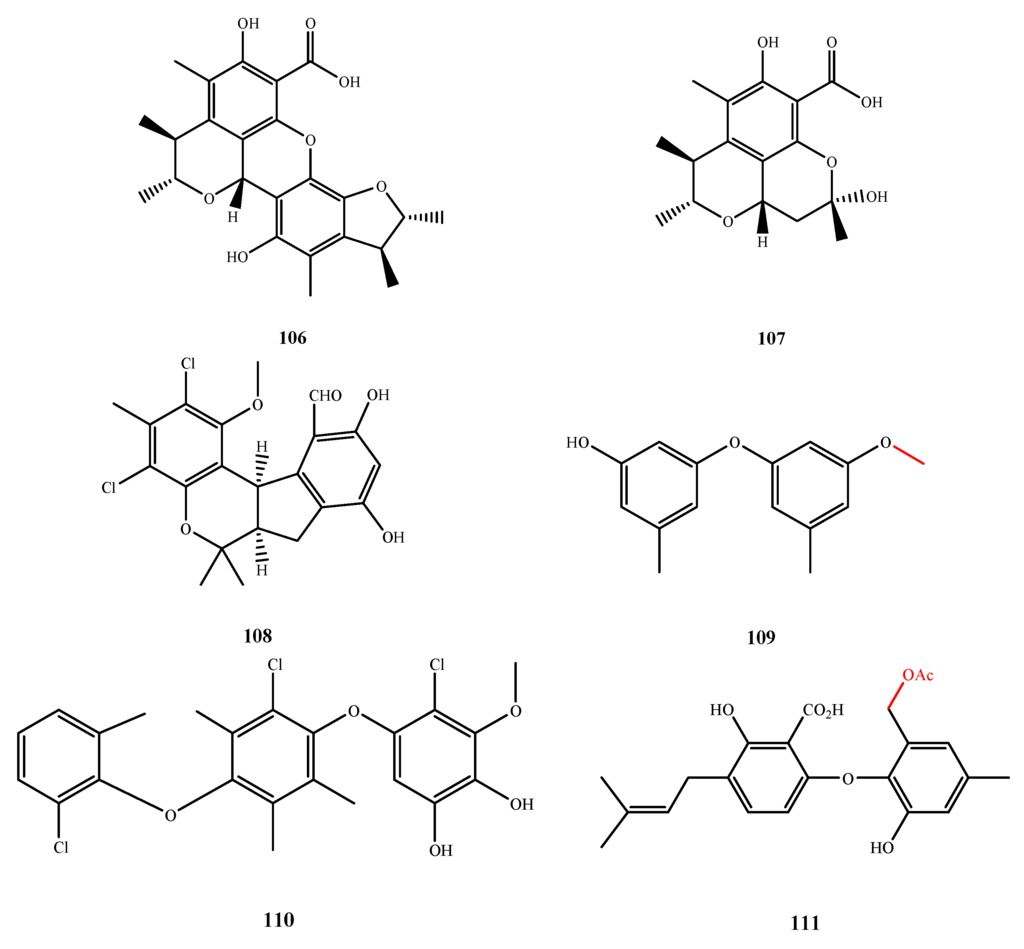 The structures of compound 106–111 were shown in Figure 24. Penicitrinols J (106) and K (107) were isolated from Penicillium sp. ML226 and showed antimicrobial activity against S. aureus CMCC26003 (IZ, 4 and 3 mm at 20 μg/disk, respectively) [80]. Pestalachloride D (108) was isolated from Pestalotiopsis sp. (ZJ-2009-7-6) and showed antibacterial activity against E. coli, V. anguillarum and V. parahaemolyticus (MIC, 5.0, 10.0 and 20.0 μM, respectively) [81]. Cordyols E (109) was isolated from Aspergillus sp. XS-20090066 and showed antibacterial activity against all test bacteria S. epidermidis, S. aureus, V. anguillarum, V. parahemolyticus and P. putida (MIC, 25.6–51.2 μM). The methoxyl group of 109 at C-3 is related to its activity, as determined by comparison to the hydroxyl of diorcinol (a known antimicrobial compound) at C-3 [82]. Microsphaerol (110) was isolated from Microsphaeropsis sp. No. 7820 and showed antibacterial activity against E. coli, B. megaterium and Microbotryum violaceum (IZ, 8, 9 and 9 mm at 50 μg/disk, respectively) [58]. Compound 111 was isolated from Penicillium sp. MA-37 and elucidated as 7-O-acetylsecopeni-cillide C (111), which was active against M. luteus and E. coli (MIC, 64 and 16 μg/mL, respectively) [79]. The acetoxyl at C-7 of 111 is important to its antibacterial activity, which was determined by comparison of the hydroxyl at C-7 in the active secopenicillide C that is substituted by an acetoxyl group at C-7 in 111.