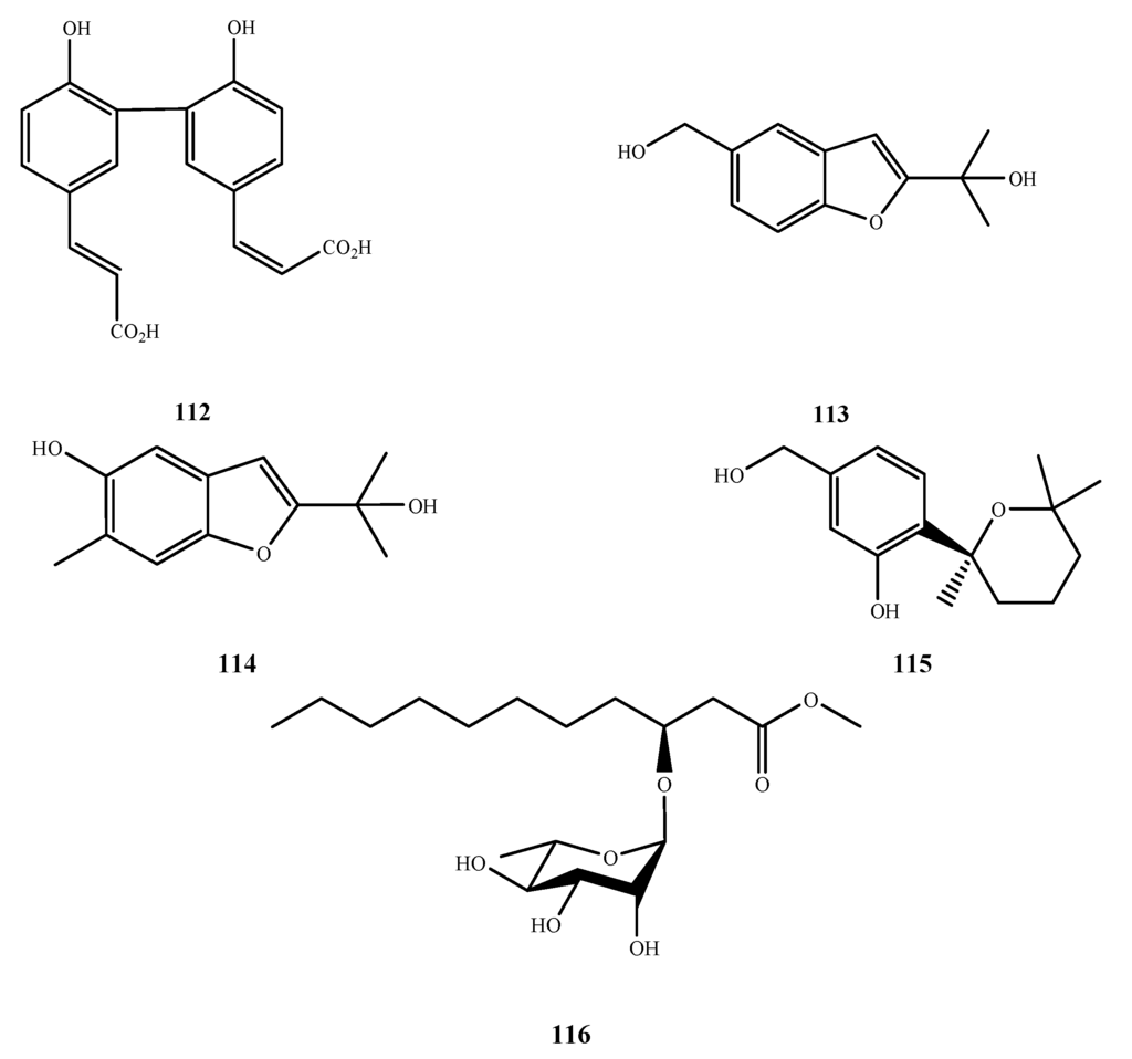 The structures of compound 112–116 were shown in Figure 25. Compound 112 was isolated from Spicaria elegans KLA-03 and showed antibacterial and antifungal activities against E. aerogenes, E. coli., P. aeruginosa, S. aureus and C. albicans (MIC, 0.15, 0.04, 0.77, 1.53 and 0.38 μM, respectively) [83]. Felinone B (113) was isolated from B. felina EN-135 and it showed inhibitory activity against P. aeruginosa (MIC, 32 μg/mL) [84]. Isoacremine D (114), an isomer of 113, was isolated from Myceliophthora lutea and exhibited antibacterial activity against S. aureus (MIC, 200 μg/mL) [85]. Compound 115 was isolated from Aspergillus sp. ZJ-2008004 and exhibited two Gram-positive bacteria, S. albus and B. subtilis (MIC, 5 and 2.5 μM, respectively) [41]. New fatty acid glycoside 116 was isolated from Scyphiphora hydrophyllacea A1 and showed inhibitory effects on S. aureus and MRSA (IZ, 3.8 and 4.7 at 500 μg/disk, respectively) [86].