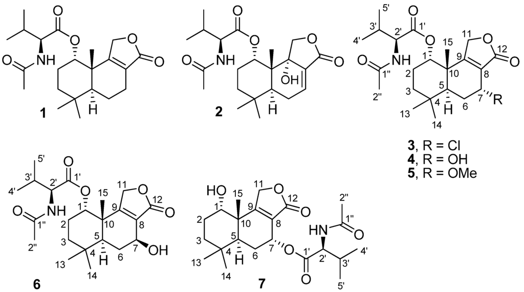Marine fungi produce a diverse array of secondary metabolites that exhibit various biological activities [1,2], and they are rich sources of antitumor agents [3]. Fungi of the genus Penicillium are rich in bioactive compounds [4,5,6,7,8], and among them, Penicillium minioluteum produces bioactive metabolites, for example, polyketide-terpenoid hybrids [9], hydrazide derivative as a potentiator of nerve growth factor [10], and antifungal tetracyclic diterpenes [11]. The fungus P. minioluteum was recently found to produce isomeric furanones through epigenetic manipulation through the addition of azacitidine, a DNA methyltransferase inhibitor [12]; it was also used in the biotransformation of clovane derivatives for the synthesis of rumphellclovane A [13]. It should be noted that the name of the fungus P. minioluteum was recently revised to “Talaromyces minioluteus” [14]. Constituents in the genus Talaromyces have been previously studied, such as nematocidal PKS-NRPS hybrid metabolites [15], nardosinane-type sesquiterpene [16], cytotoxic norsesquiterpene peroxides [17], and acetylcholinesterase inhibitors [18]. The present work reports the isolation and characterization of drimane sesquiterpene lactones (1–7) from the marine fungus T. minioluteus strain PILE 14-5 (Figure 1). Four new compounds (3, 4, 6 and 7) were sesquiterpene lactones conjugated with N-acetyl-l-valine, and such sesquiterpenes are rare in nature. So far, only five derivatives of a drimane conjugated with amino acids have been reported to date [19,20,21]. Cytotoxic activity and the inhibitory activity toward caspase-3 enzyme of 1–7 are also reported.