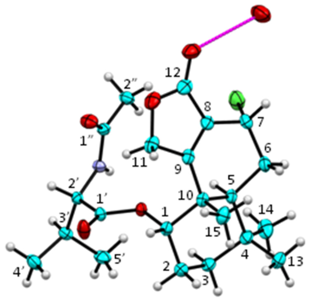 DEPT spectra revealed the presence of six methyl, four methylene, five methine, and seven quaternary carbons. 1H–1H COSY spectrum established partial structures of H-1/H2-2/H2-3; H-5/H2-6/H-7; and H-2′/H-3′/H3-4′/H3-5′ in 3. HMBC spectrum of 3 displayed correlations from H-1 to C-3 and C-10; H2-2 to C-4 and C-10; H2-3 to C-1, C-4, C-5, and C-14; H-5 to C-4, C-7, C-9, C-13, C-14, and C-15; H2-6 to C-4, C-8, and C-10; H-7 to C-5, C-8, C-9, and C-12; H2-11 to C-8, C-9, and C-12; both H3-13 and H3-14 to C-3, C-4, and C-5; and H3-15 to C-1, C-5, C-9, and C-10. These HMBC correlations, as well as the 1H–1H COSY correlations mentioned above, established a structure of a drimane sesquiterpene lactone, which was the same core structure as that of purpuride (1) [19]. The fragment of H-2′/H-3′/H3-4′/H3-5′ from the 1H–1H COSY spectrum, together with the HMBC correlations from H-2′ to C-1′; NH proton to C-1′, C-2′ and C-1′′; and H3-2′′ to C-1′′, established a structure of N-acetyl-valine in 3. Chemical shifts (δH 5.02; δC 74.3) of H-1 in 3 suggested that C-1 was attached to an oxygen atom, and the downfield 1H resonance (δH 5.02) implied the presence of an ester (or ether) linkage at C-1. The HMBC correlation from H-1 to C-1′ readily indicated that the drimane unit was linked, through an ester bond at C-1, with the N-acetyl-valine residue. These spectroscopic data constructed a planar structure of 3, and the assignment of 1H and 13C resonances in 3 is shown in Table 1. Small values of coupling constants for H-1 (brs) and H-7 (1.8 Hz) in 3 suggested that both H-1 and H-7 were equatorial. A single crystal of minioluteumide A (3) was subsequently subjected to an X-ray analysis, using CuKα radiation together with determining the Flack parameter [22]. It is known that an X-ray analysis using CuKα radiation with the Flack parameter provides a reliable determination of the absolute configuration [22]. Finally, the structure and absolute configuration of minioluteumide A (3) were confirmed by an X-ray analysis; the ORTEP plot is depicted in Figure 2. It should be noted that the amino acid in 3 is l-valine, which is also found in purpuride (1) and berkedrimane B (2) [19,20].