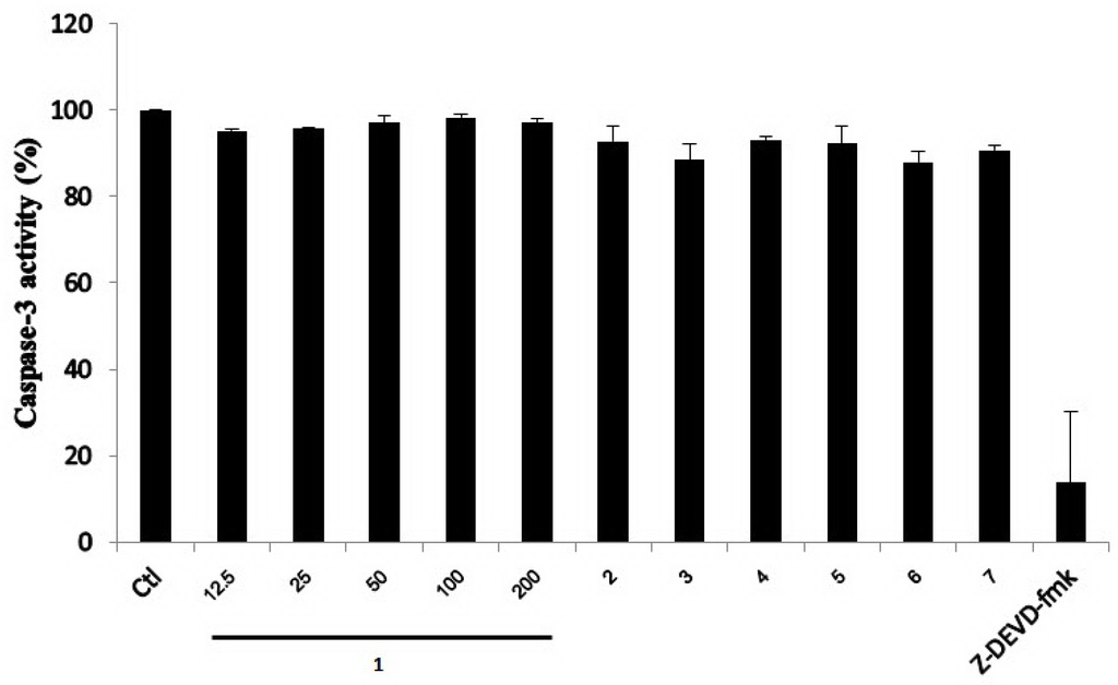 Effect of compounds 1–7 on caspase-3 enzymatic activity. Apoptotic HepG2 cell lysates were individually incubated with various concentrations (12.5–200 μM) of purpuride (1) and 200 µM of compounds 2–7. A caspase-3 inhibitor (5 µM), Z-DEVD-fmk, was used as a positive control. Data are mean + SD of three independent experiments. Ctl = A control without compounds.